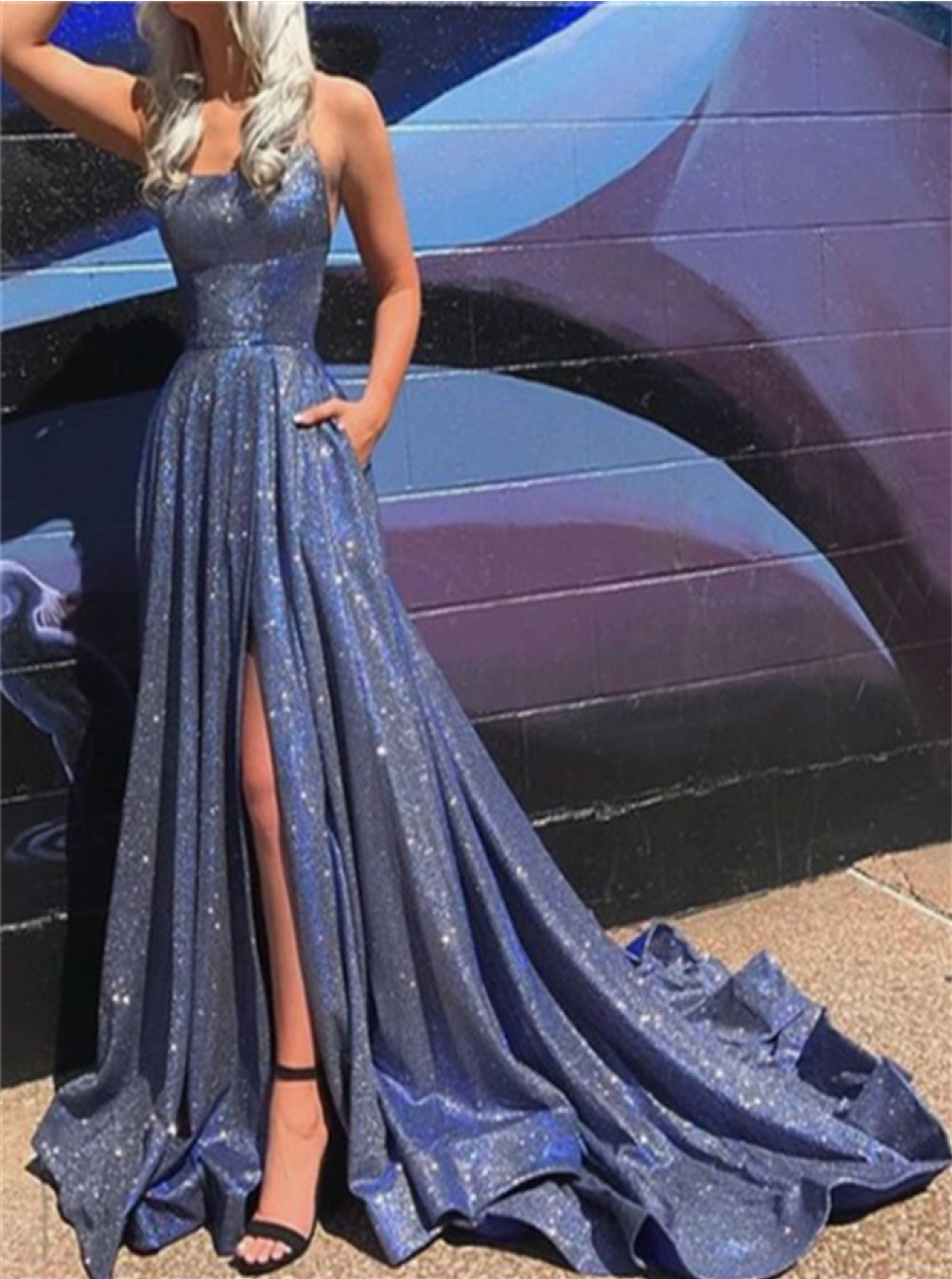 MC005,A-Line Beautiful Back Sparkle Prom Formal Evening Dress Scoop Neck Sleeveless Court Train Polyester with Split