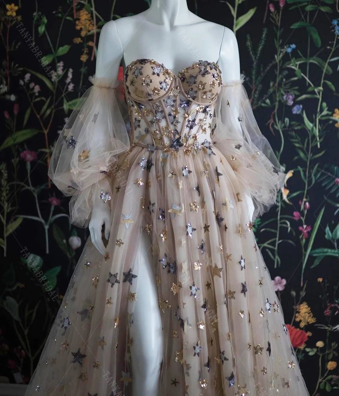 MC067,Off the shoulder sweetheart stars a line bubble sleeves tulle long formal dress,starry prom dresses