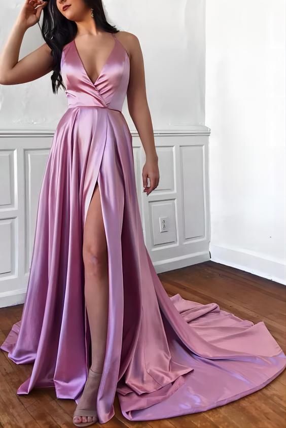 MC180,Deep V-neck Sexy Long Prom Dresses with Slit,Pink Silk Satin Evening Party Dress