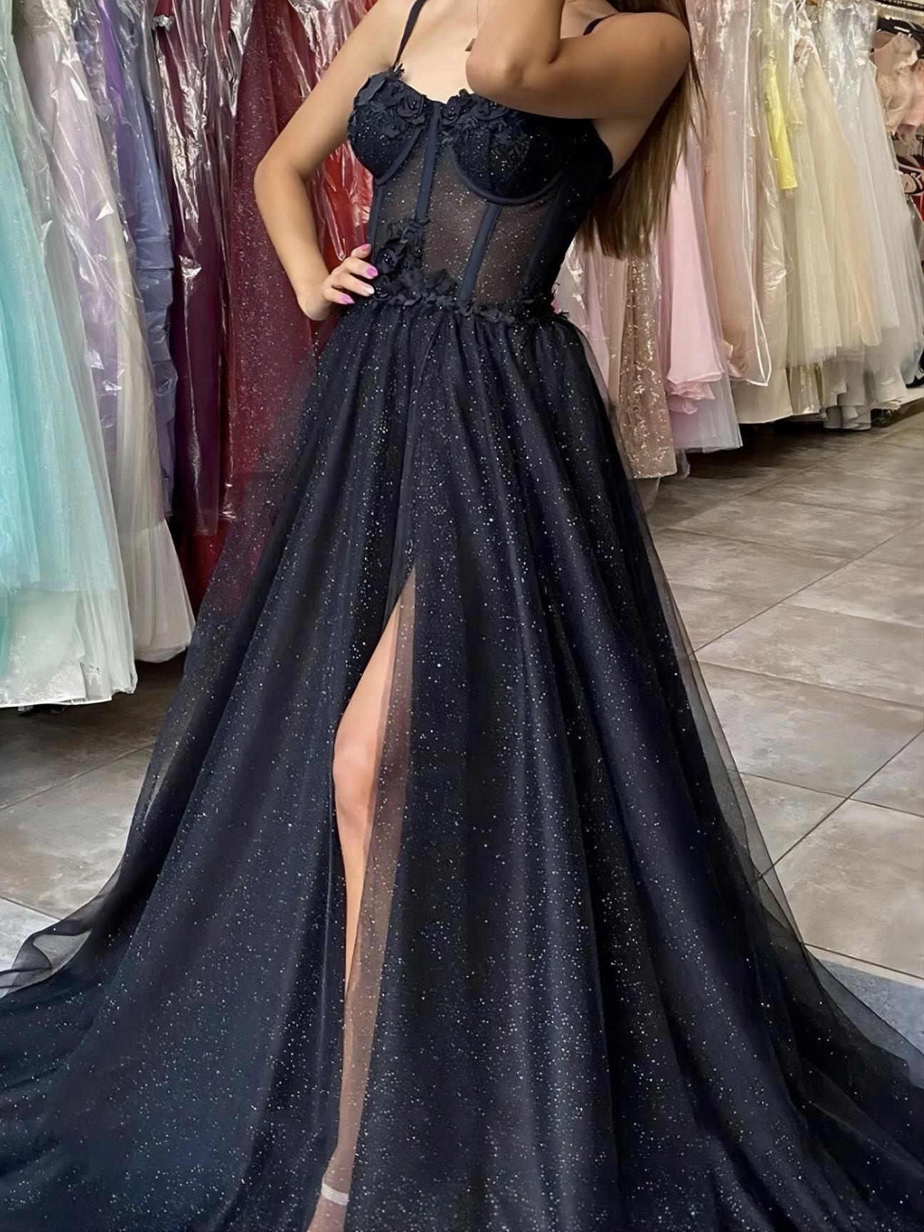MC202,Sparkle Black A-Line Long Prom Dresses,High Split Sequined Evening Formal Gown