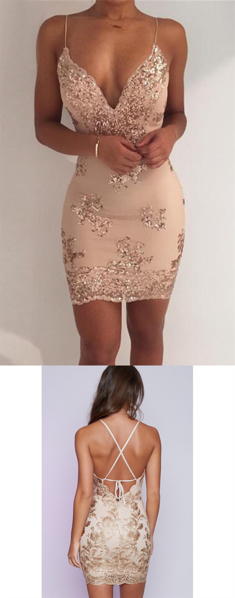 MC019,short champagne sleeveless v-neck backless spaghetti-straps homecoming dress with sequins