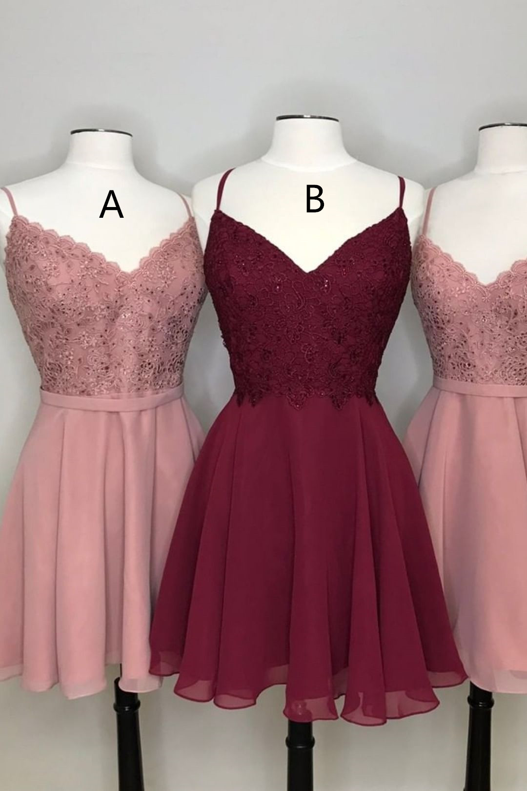 MC027,sleeveless v-neck spaghetti-straps applique lace chiffon homecoming dress