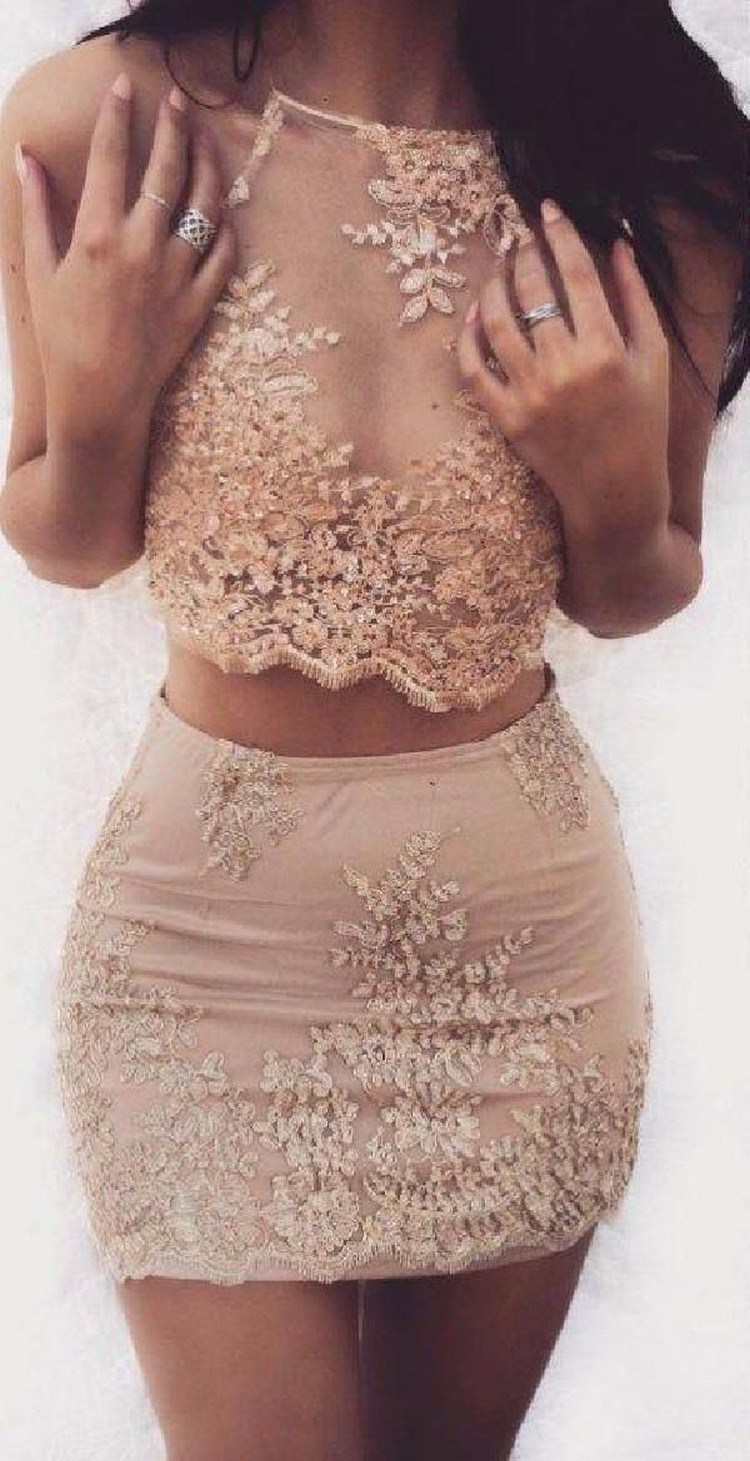 MC020,two piece champagne sleeveless halter applique lace homecoming dress