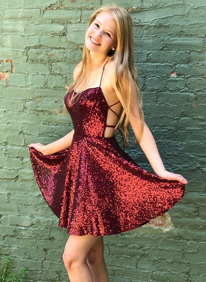 MC034,Criss Cross Back Burgundy Sequins Homecoming Dress Spaghetti Straps