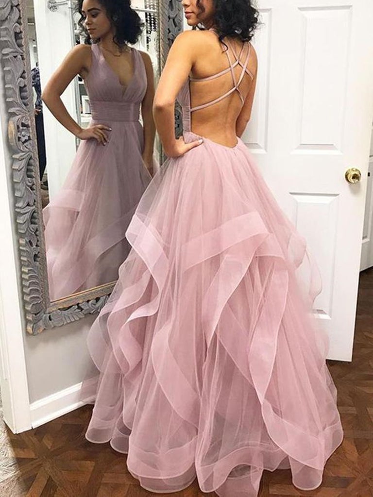 MC073,A Line V Neck Dusty Pink Long Prom Dresses With Straps,Backless Ruffles Graduation Dress