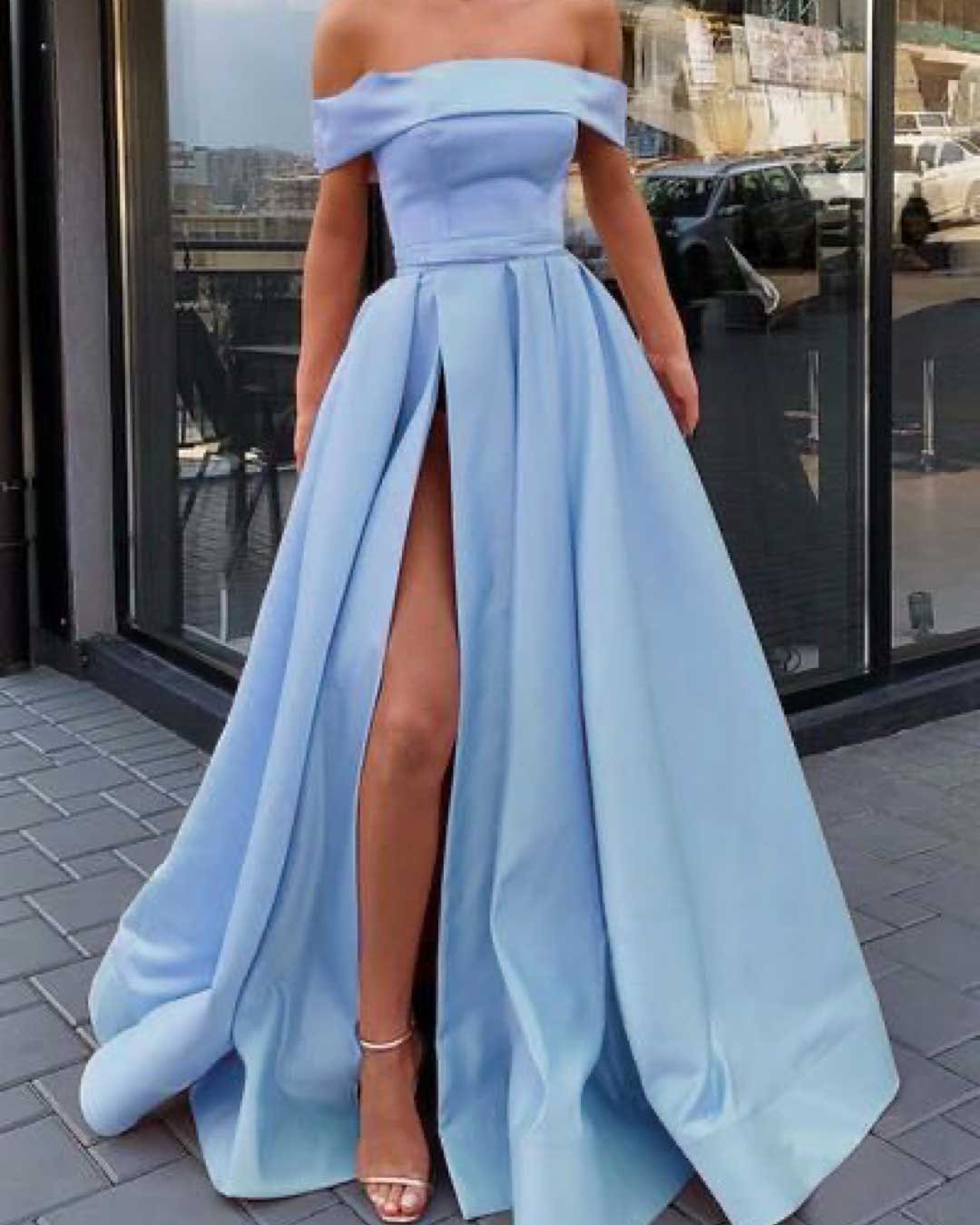 MC091,Satin Off Shoulder Sleeveless Long Split Prom Dress
