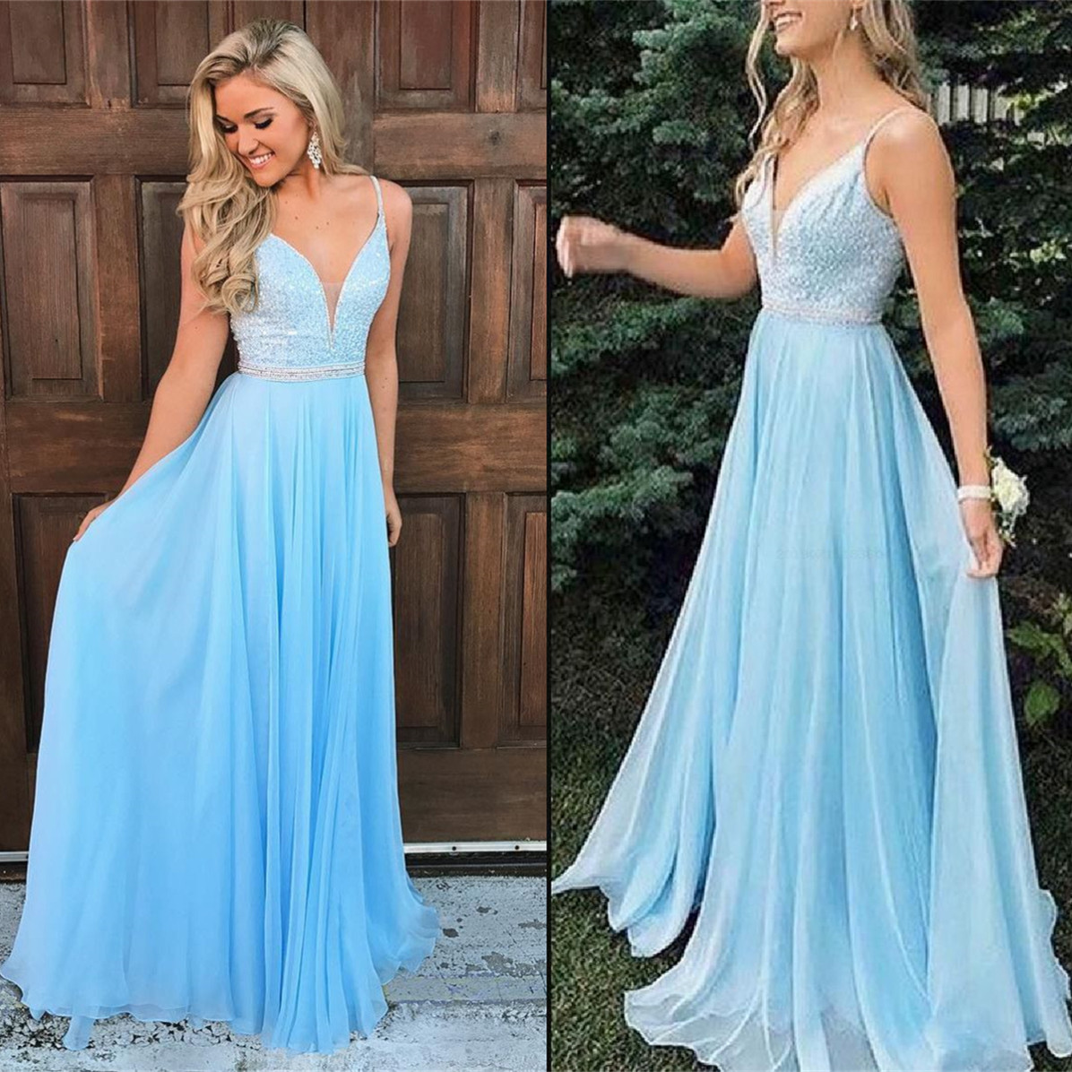 MC098,Sky blue prom dress v-neck chiffon long prom dresses beaded party dress
