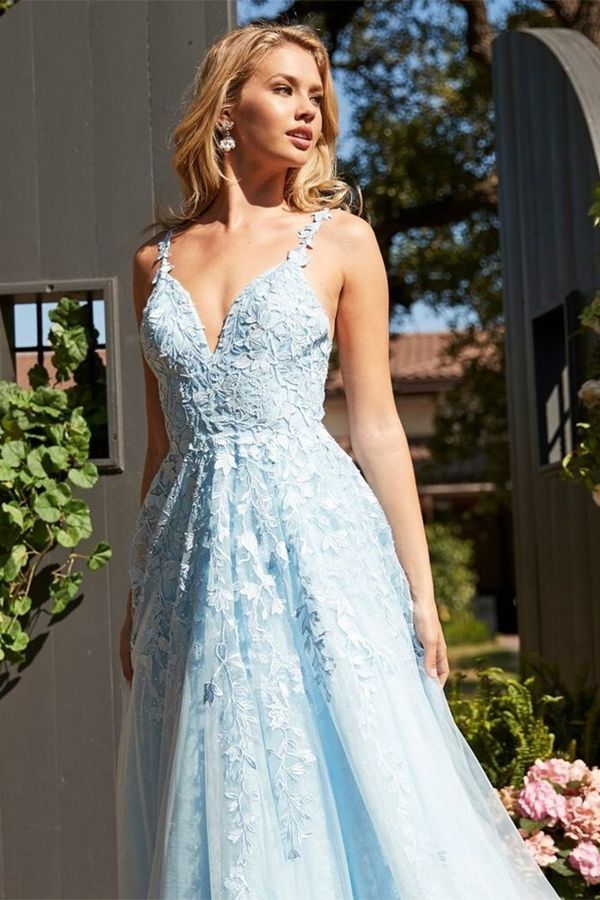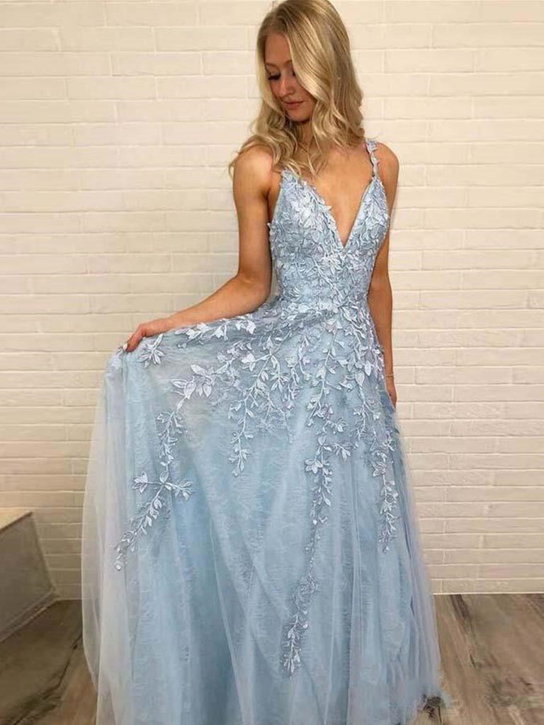 MC103,Light blue lace prom dresses applique tulle prom dress