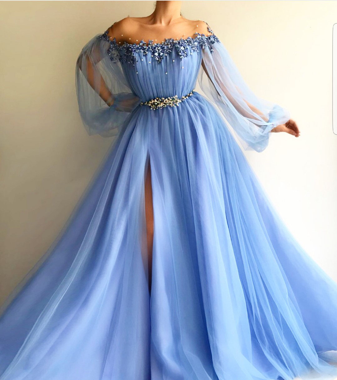 MC109,Blue off the shoulder prom dress bubble sleeves evening party dresses