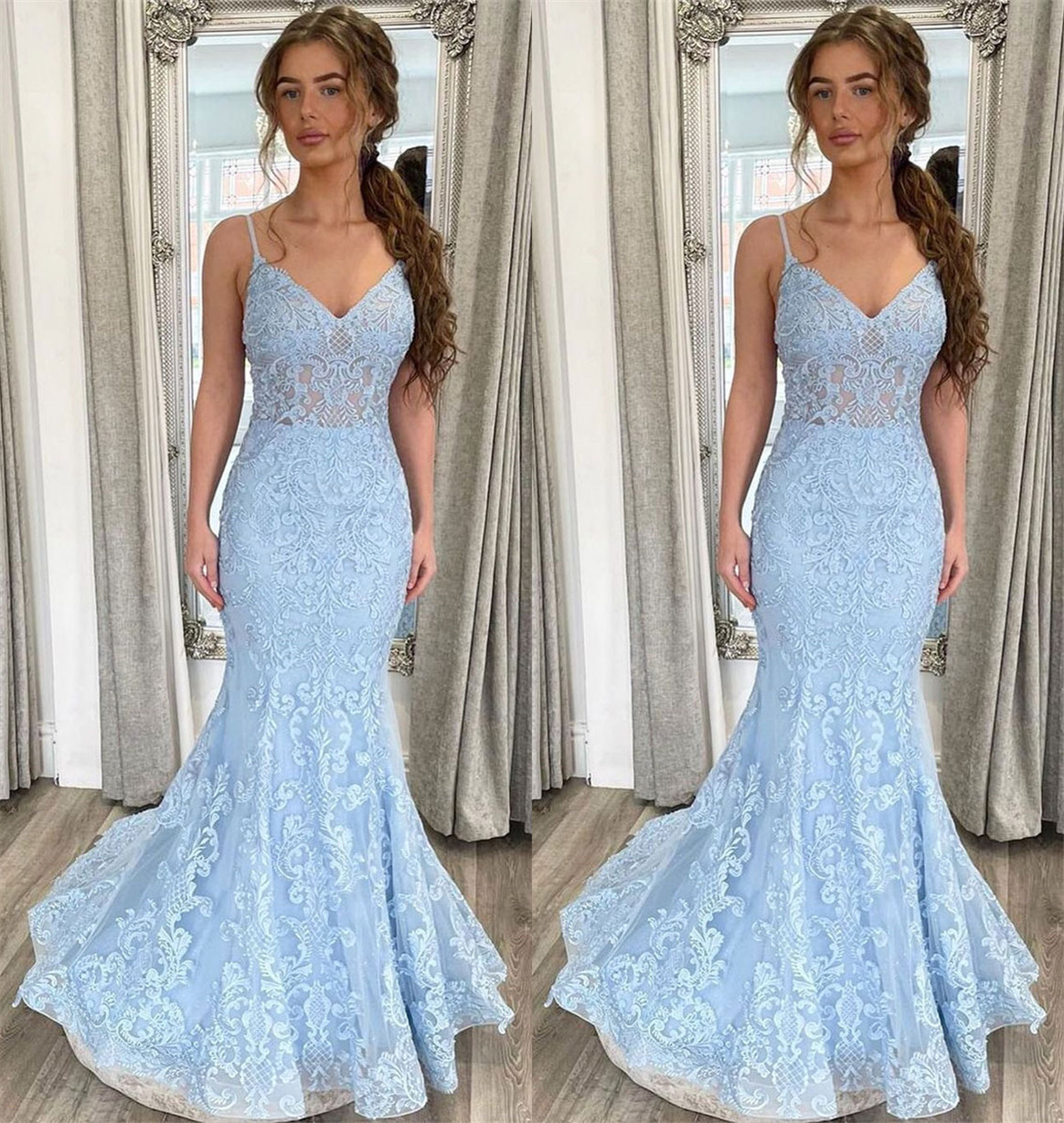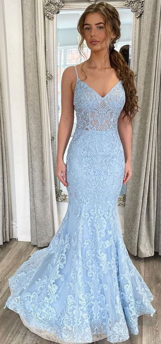 MC110,Light blue lace prom dress mermaid long evening party dresses