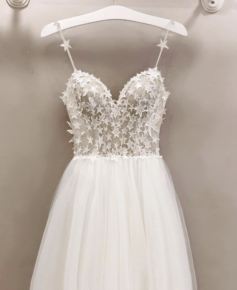 MC168,Cute White Stars Prom Dresses,V-Neck Starry Tulle White Prom Evening Gown