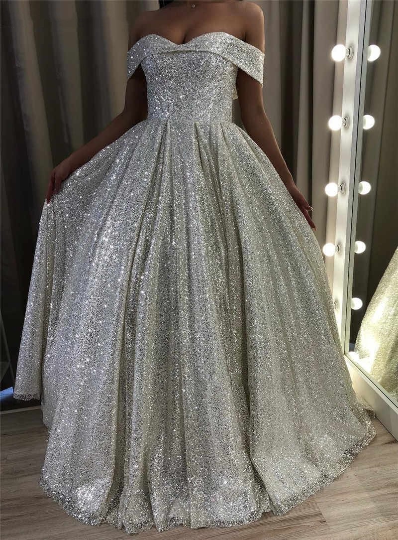 MC170,Sparkle A-Line Sequin Long Prom Evening Dresses,Silver Off The Shoulder Formal Gown
