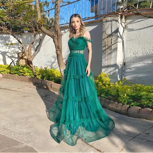 MC194,Green Ruffles Tulle Long Prom Dresses,Off The Shoulder Sleeveless Evening Dresses